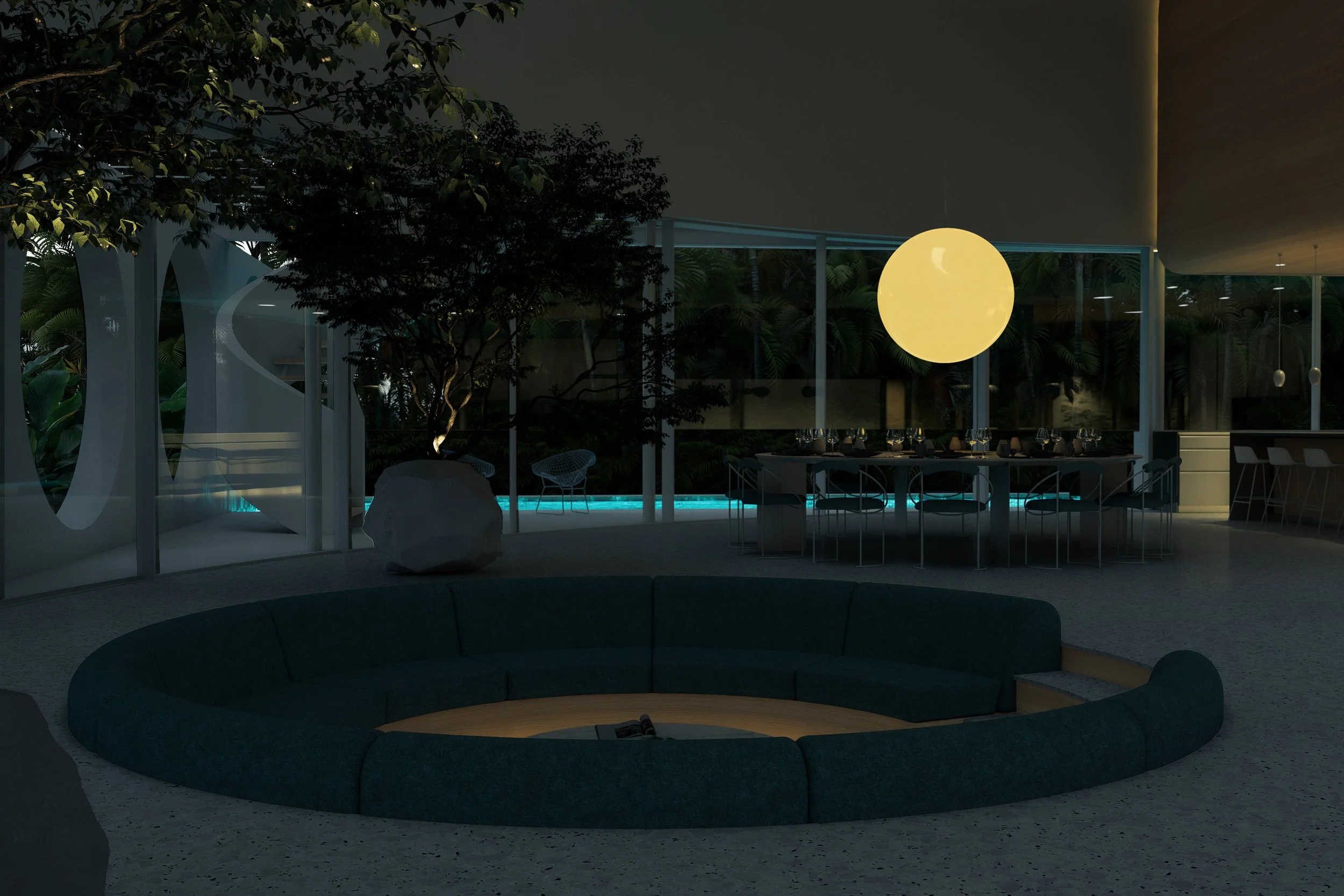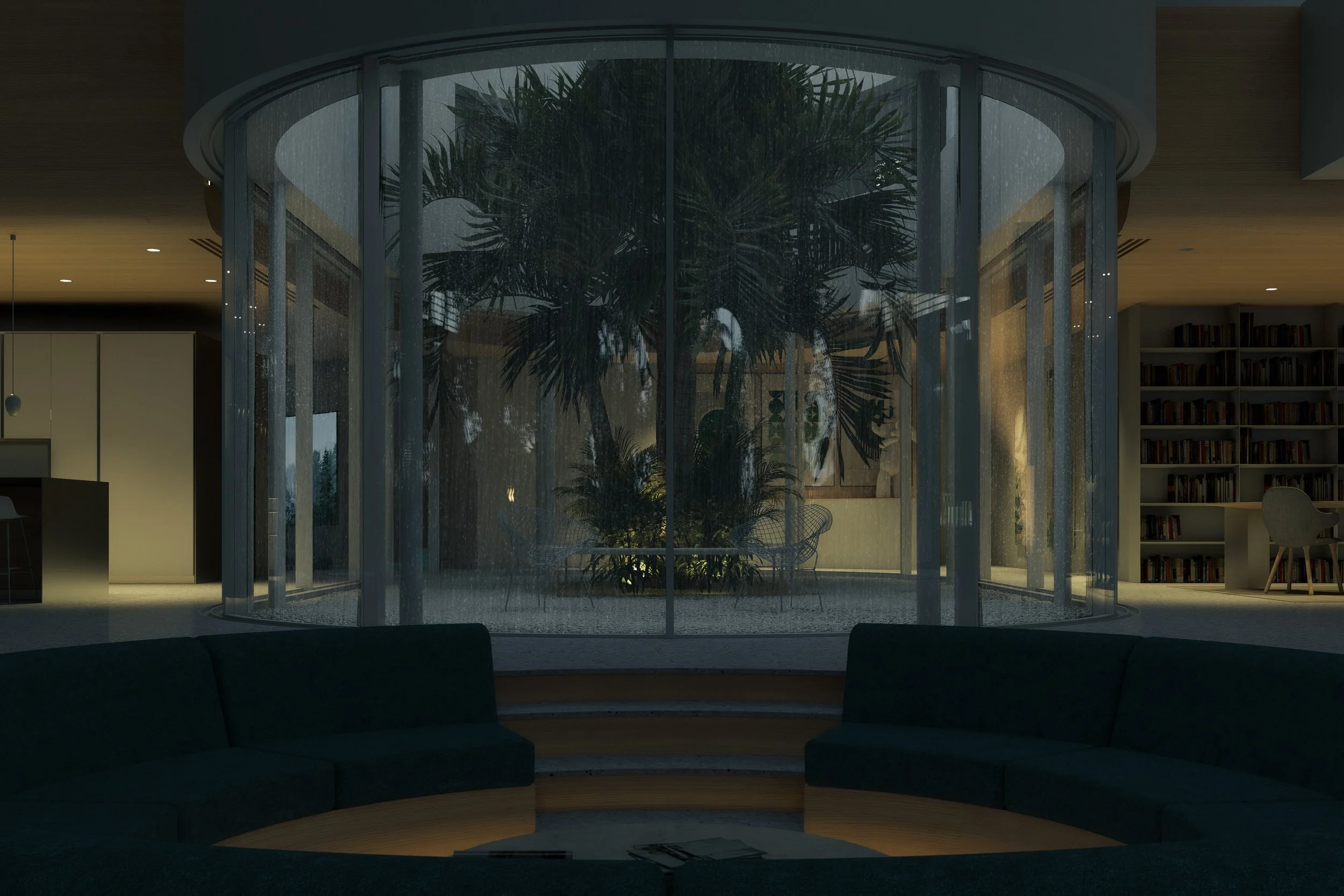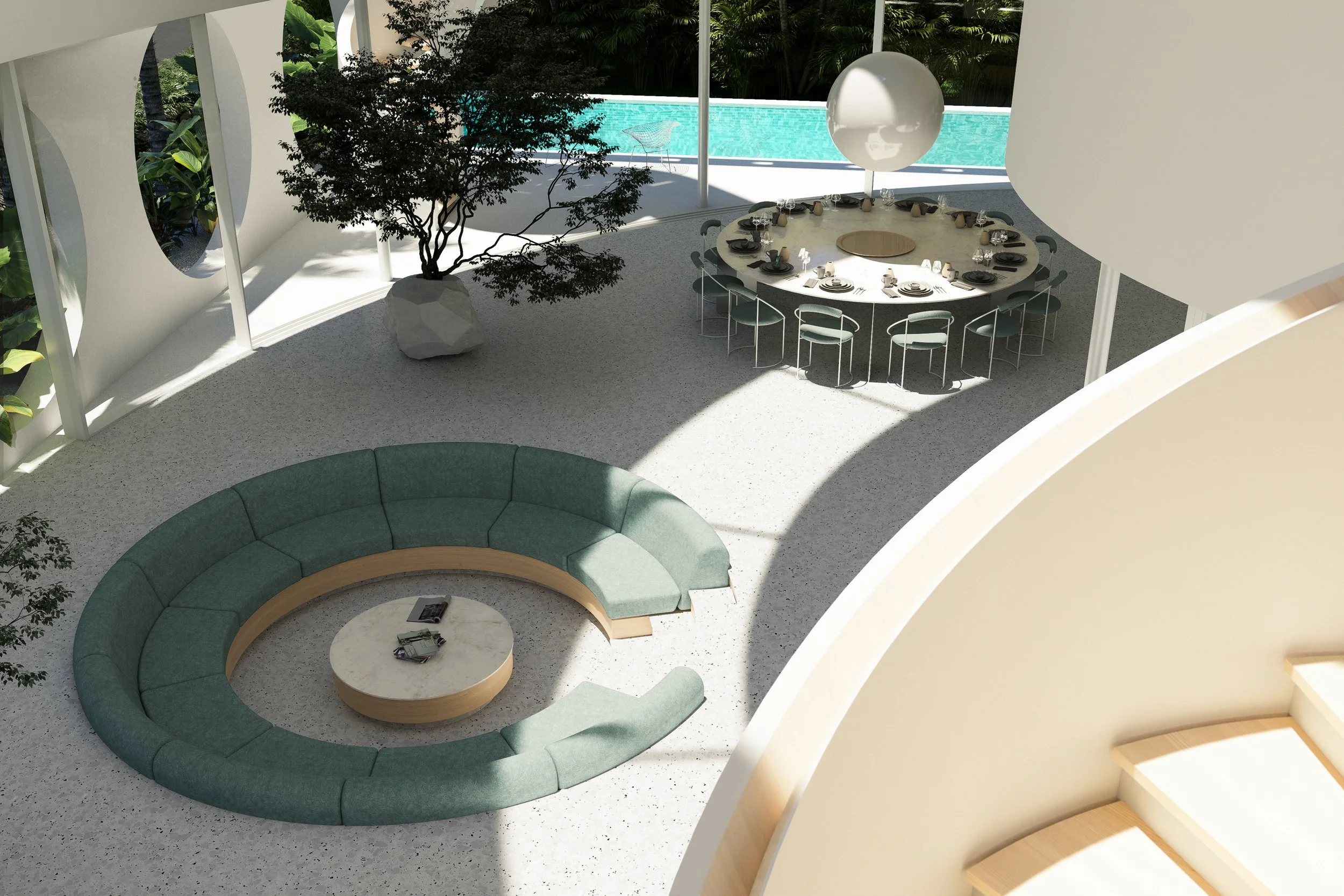 Elliptica is a single family home organized around an elliptical layout inscribed within a rectangular boundary. The spaces between these two geometries become layered thresholds—semi-outdoor zones that create privacy from the street while allowing the home to flow seamlessly between interior and exterior life. This interstitial condition defines the project’s spatial rhythm, guiding movement around the central courtyard garden and connecting the social and private areas of the home through a continuous loop.