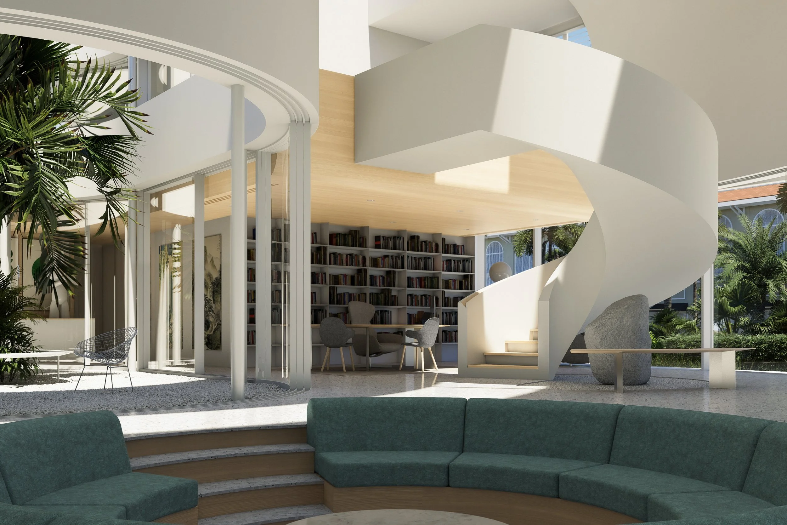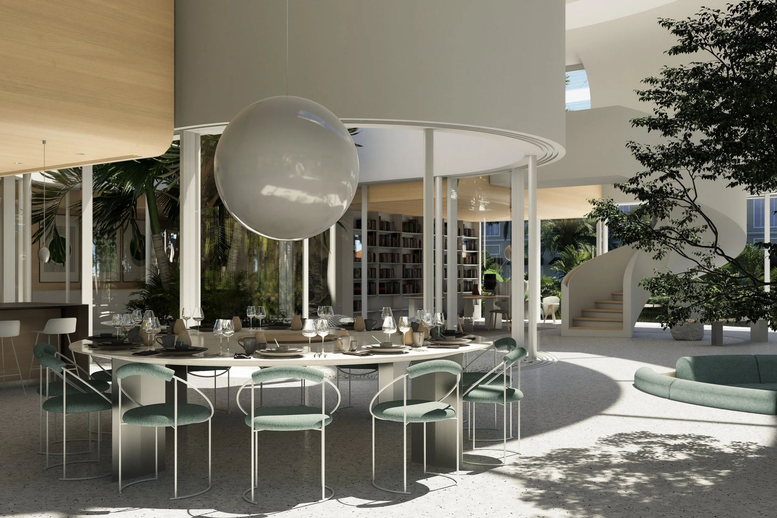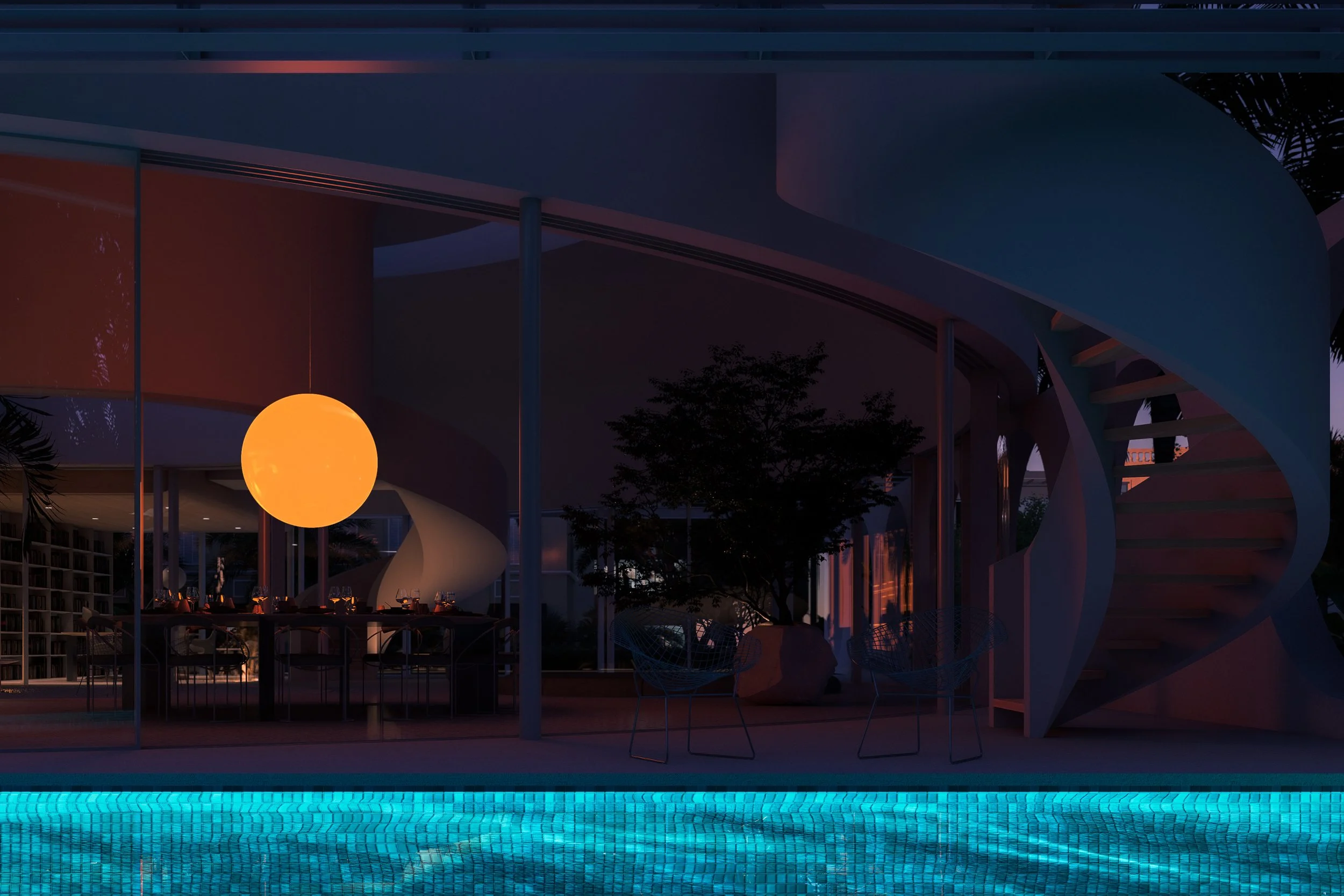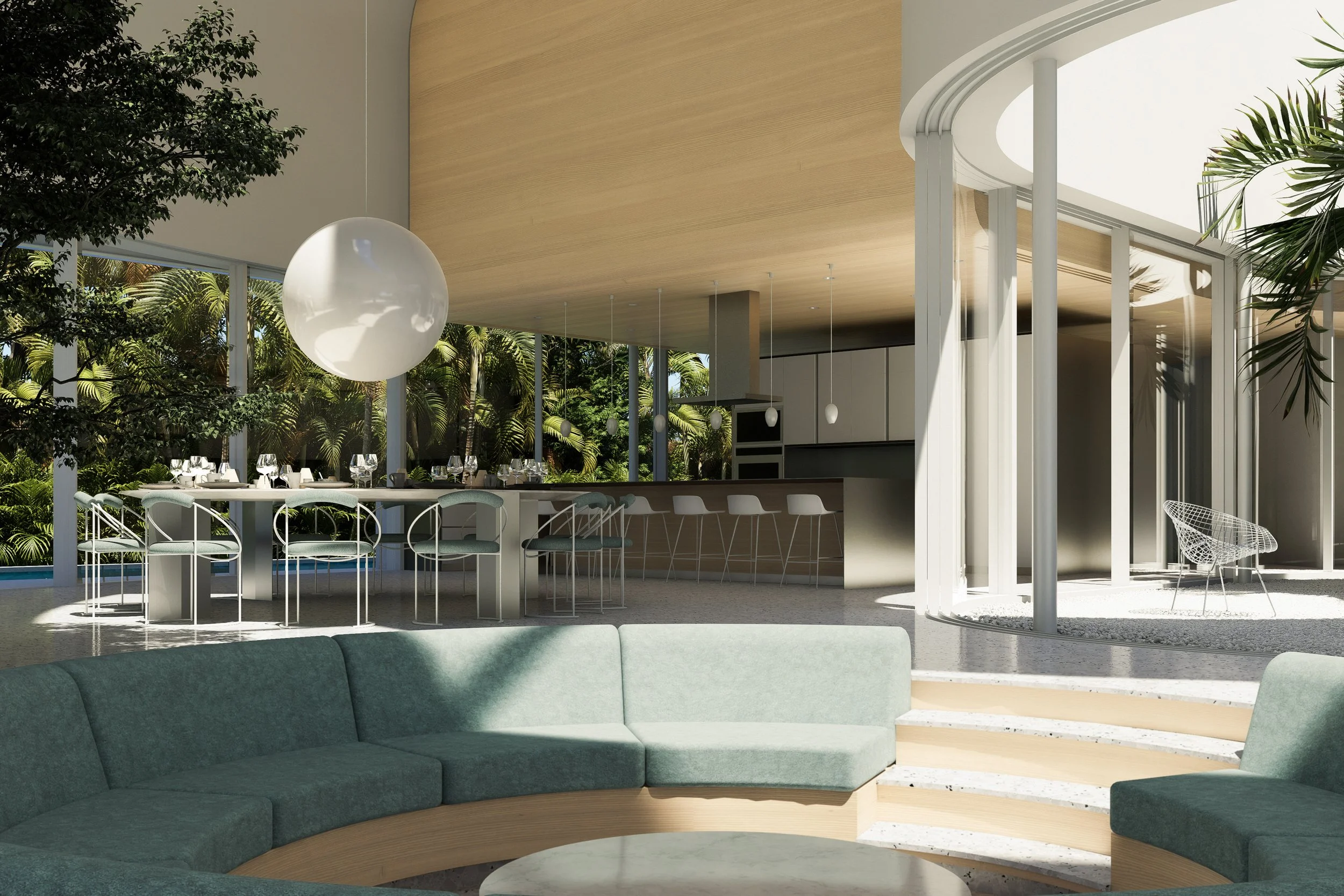 Materially, Elliptica draws inspiration from Miami’s Art Deco lineage and tropical modernist tradition. Curved concrete walls, circular porthole cutouts, and slender louvered screens reinterpret these familiar local motifs through a minimal and contemporary lens. The result is a home that feels both sculptural and serene—balancing precision and softness, technology and craft.