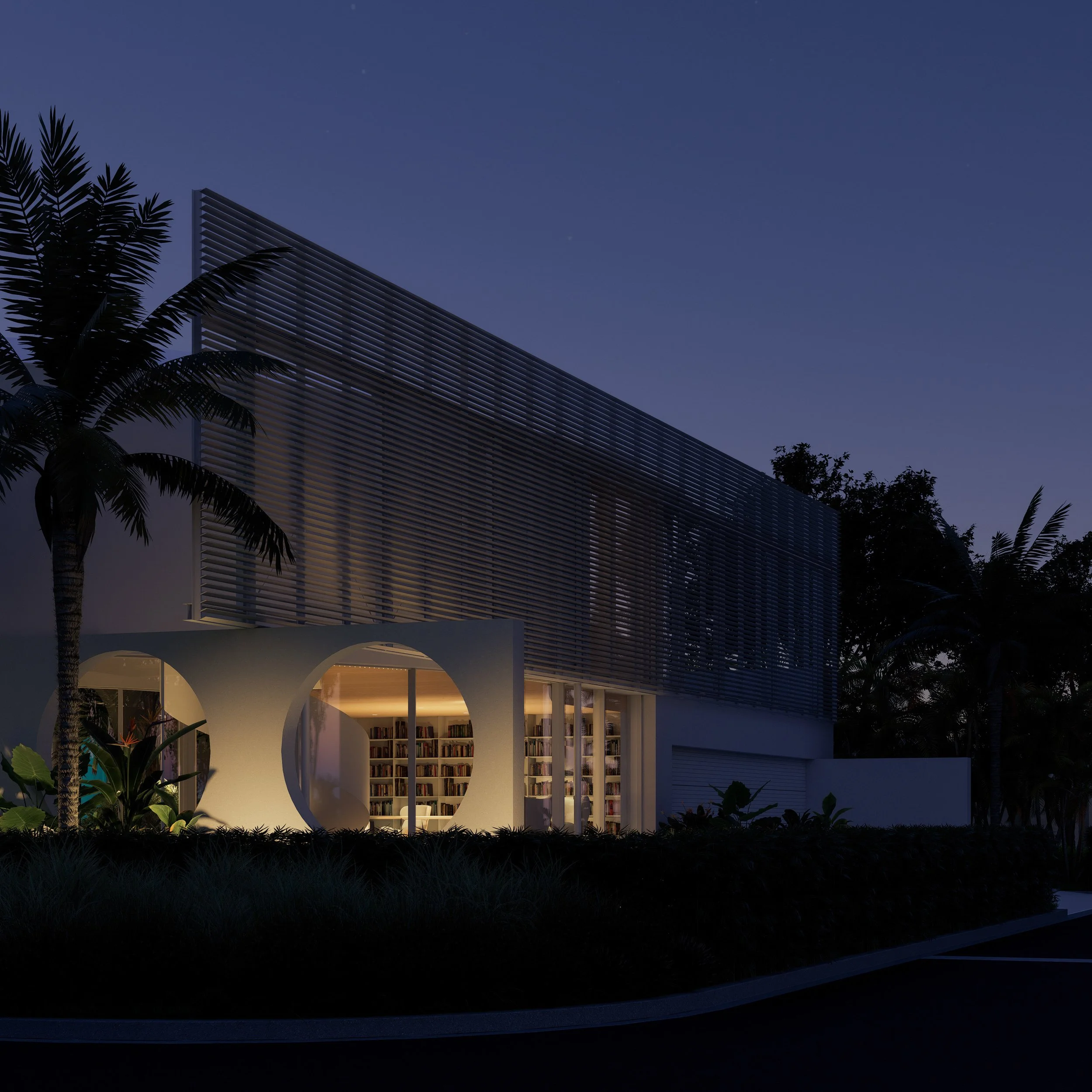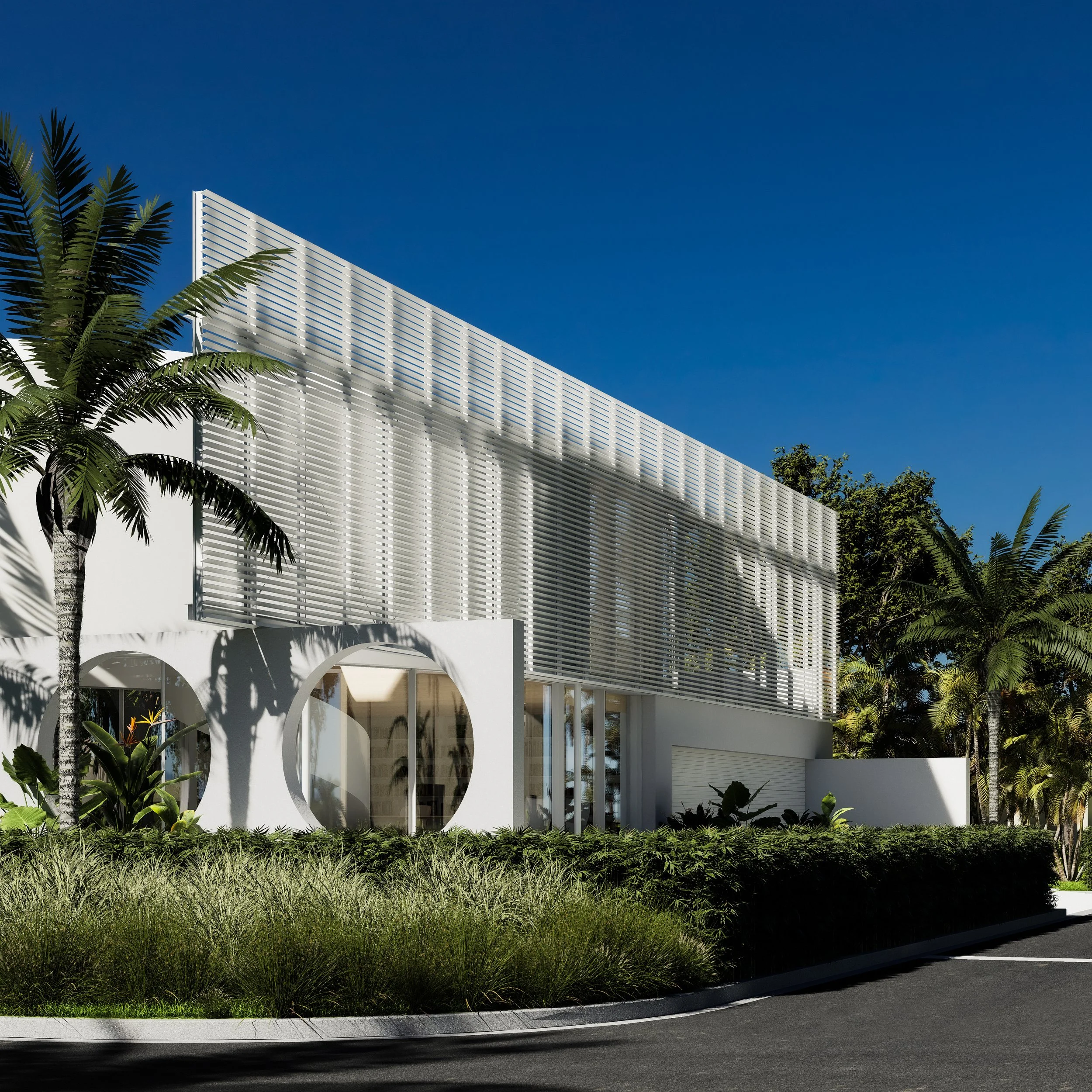 Located on a corner lot in Surfside, Florida, the residence responds to its dual context: an active commercial edge across Abbott Avenue and a quiet residential frontage along 94th Street. Layered louvers, terraces, and shaded recesses mediate these contrasting conditions, filtering light and views while maintaining a sense of openness.